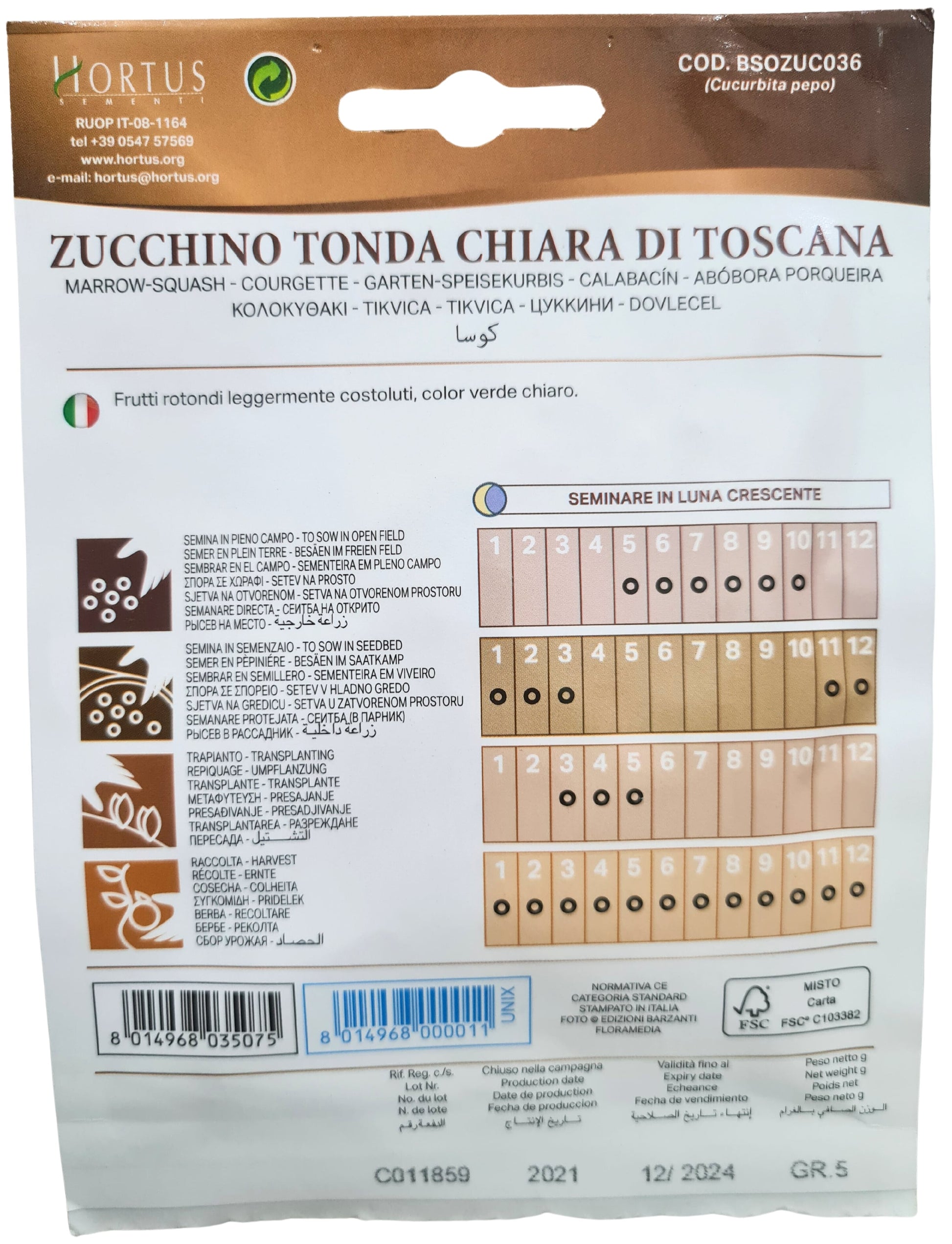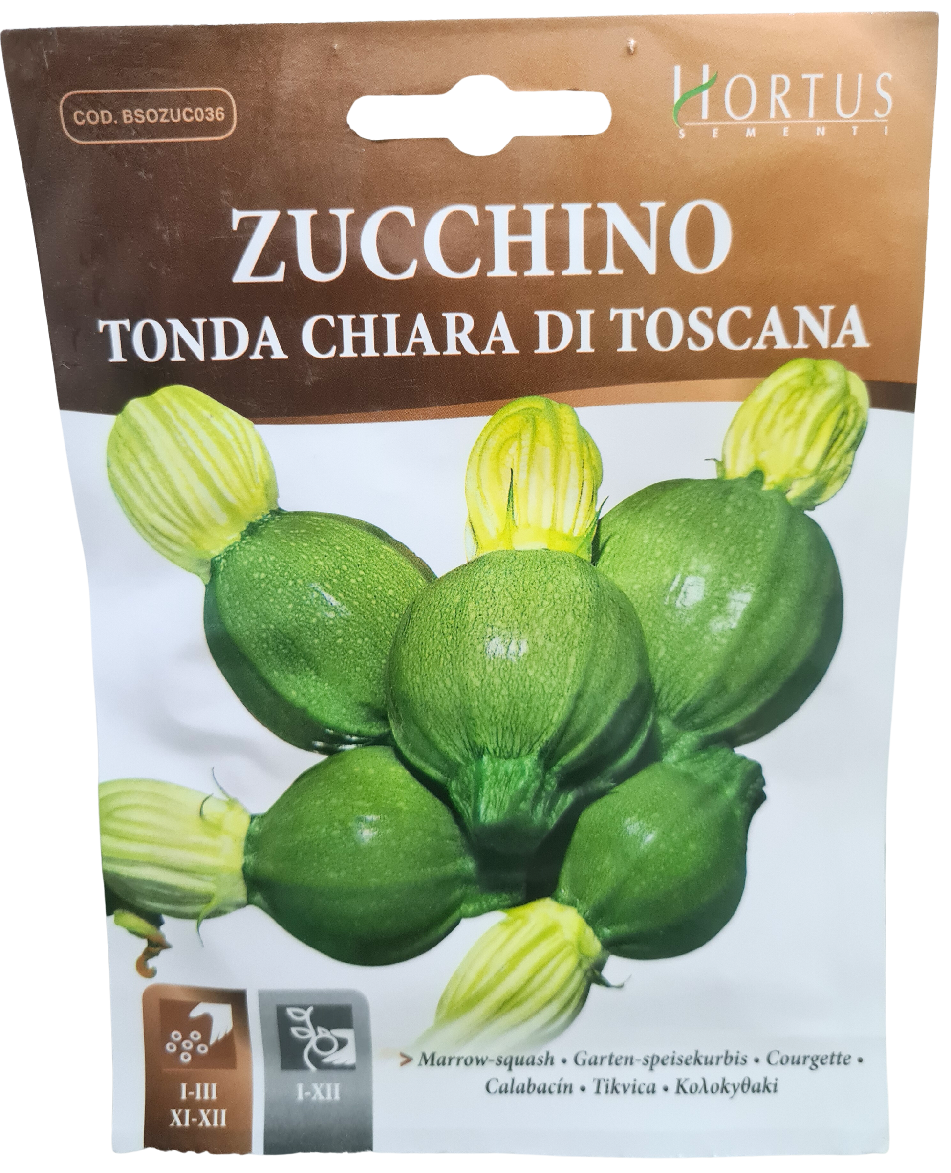 Zucchino Tondo di Toscana is a versatile, round fruited variety which can be cropped from golf ball size for eating raw whole, slightly larger for slicing or stir frying, to tennis ball size for stuffing.Seeding Depth: 2-3 cmSpacing between plants: 40-60 cmSpacing between rows: 120-150 cm