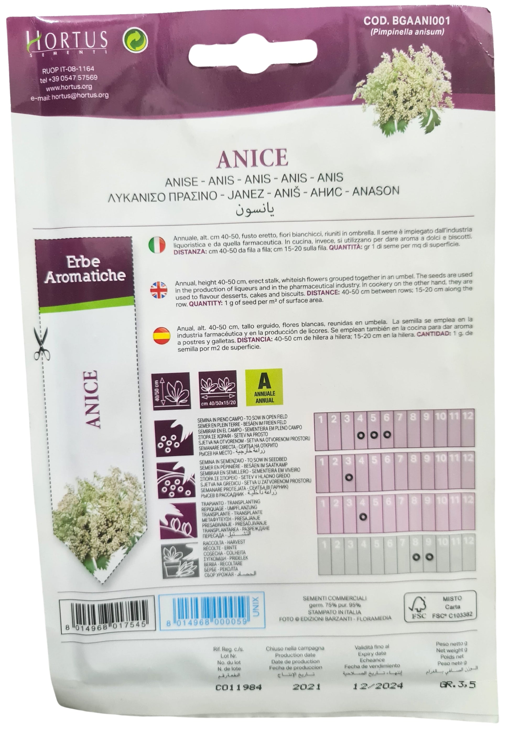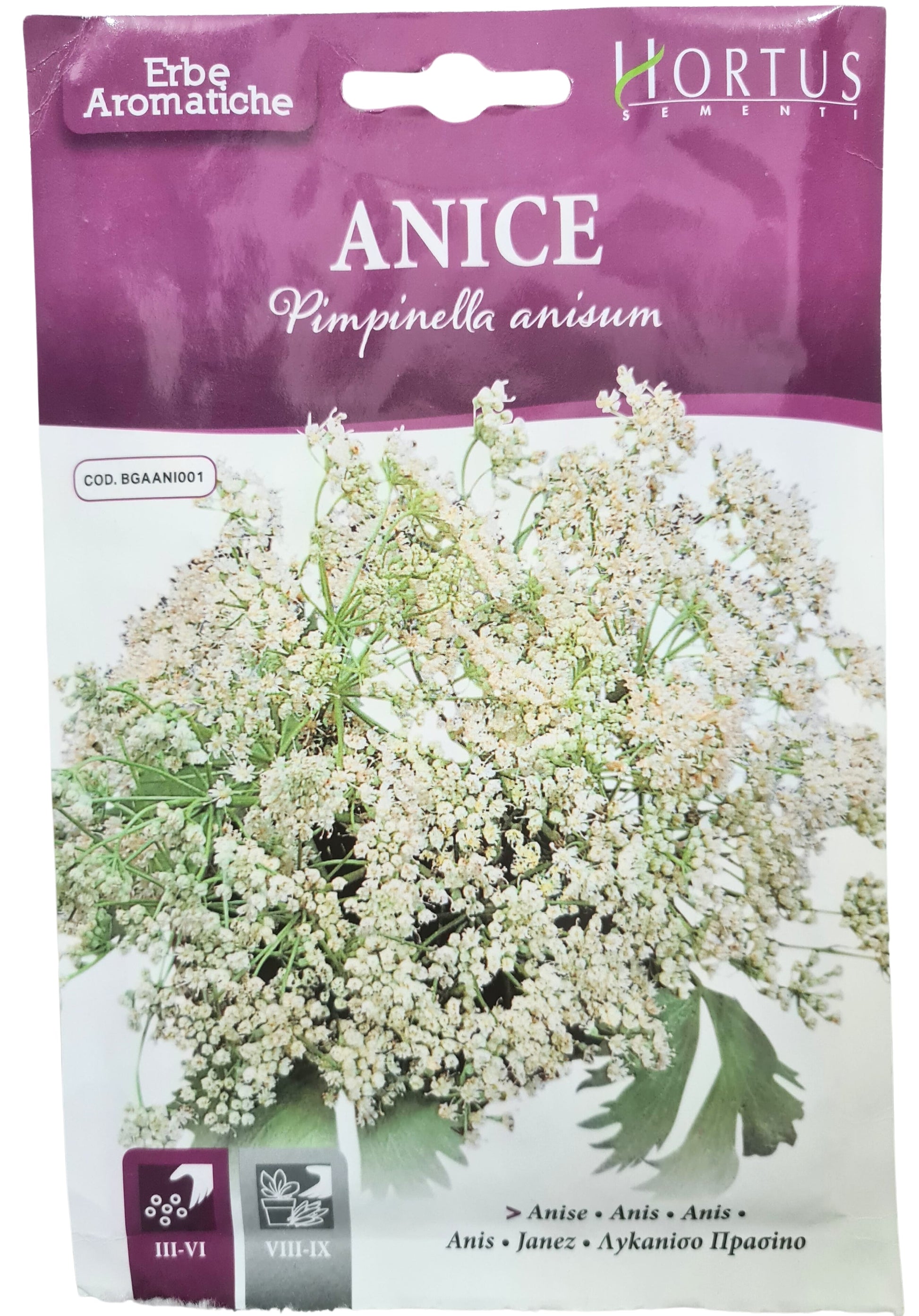 Annual height 40-50 cm, erect stalk,whiteish flowers grouped together in an umbel. The seeds are used in the production of liqueurs and in the pharmaceutical industry. In cookery on the other hand, they are used to flavour desserts, cakes and biscuits. Distance: 40-50 cm between rows; 15-20 cm along the row.Quantity: 1 g of seed per m² of surface area.