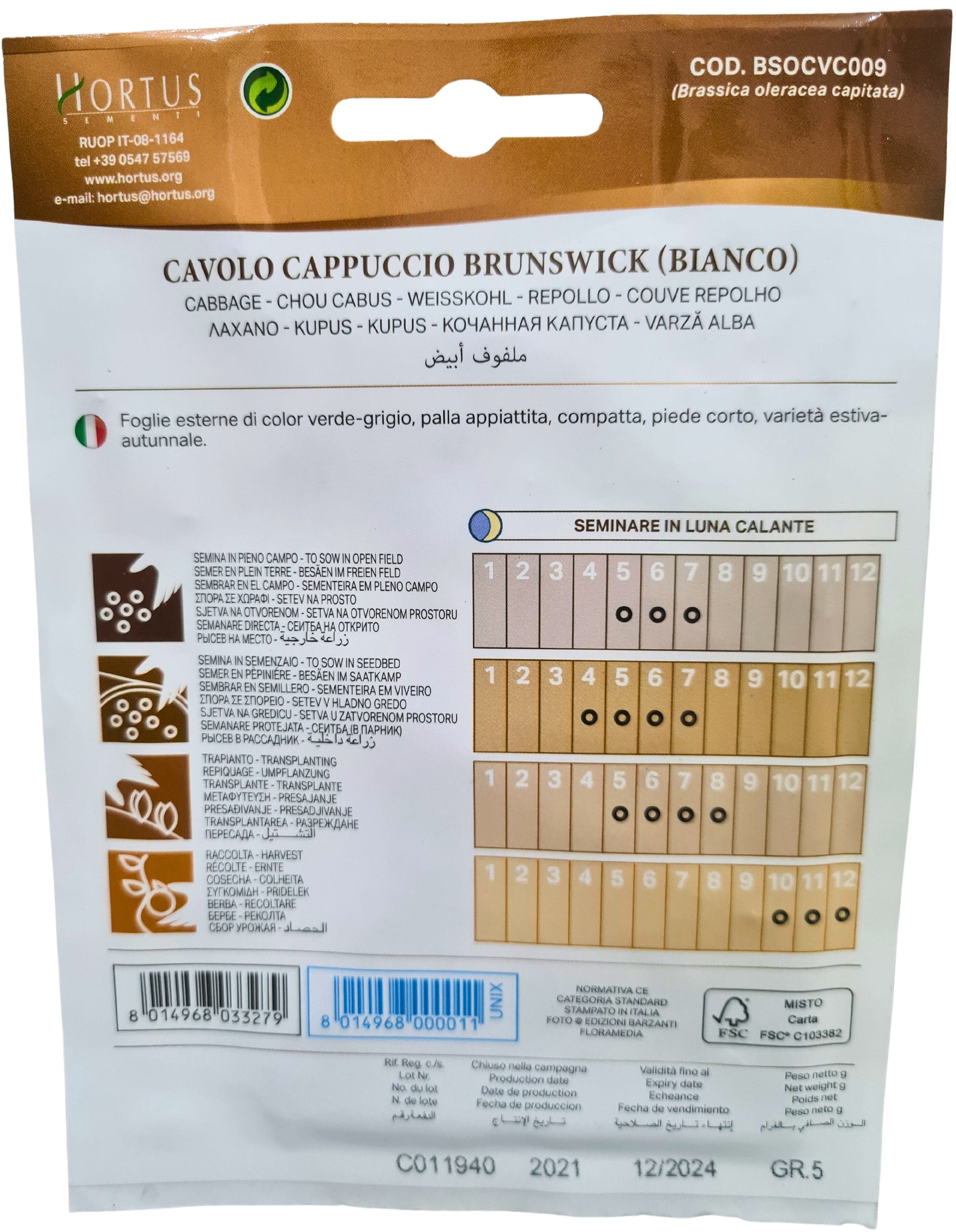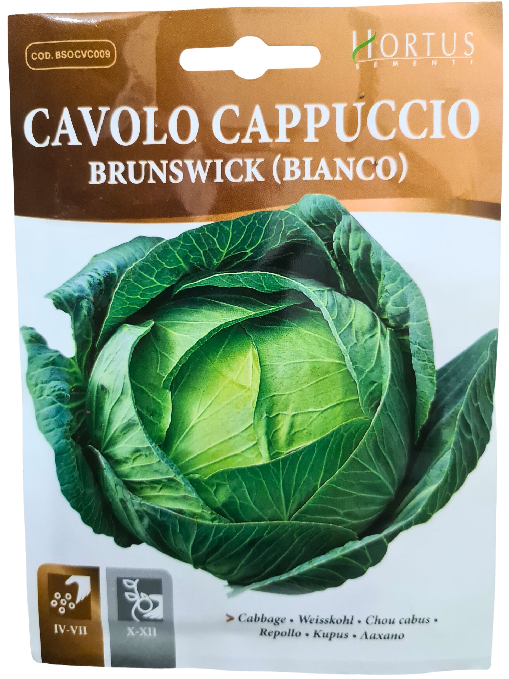 Late variety. Green outer leaves. The short-stemmed plant forms a very compact round-flattened head weighing 3-5 kg.SOWING: in August-September, transplant when the plants have reached about 6 leaves. The harvest takes place in June.Distance between lines:50/70 cmDistance in lines :40/60 cm