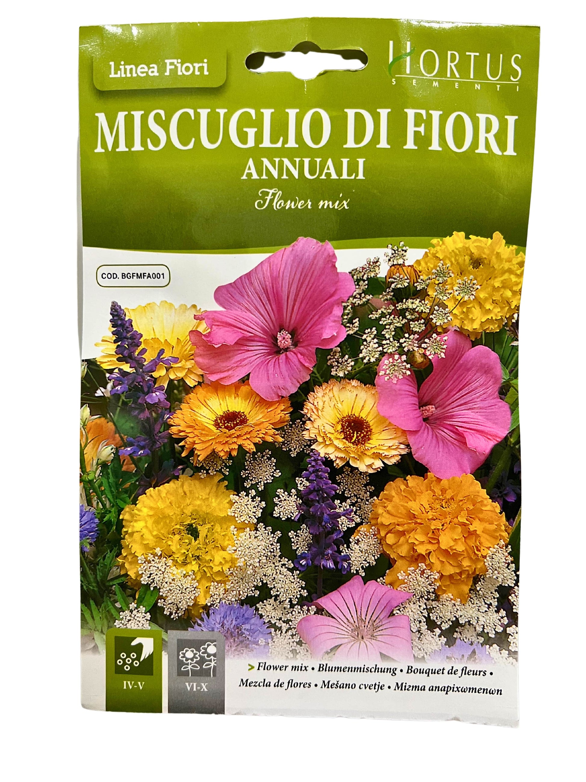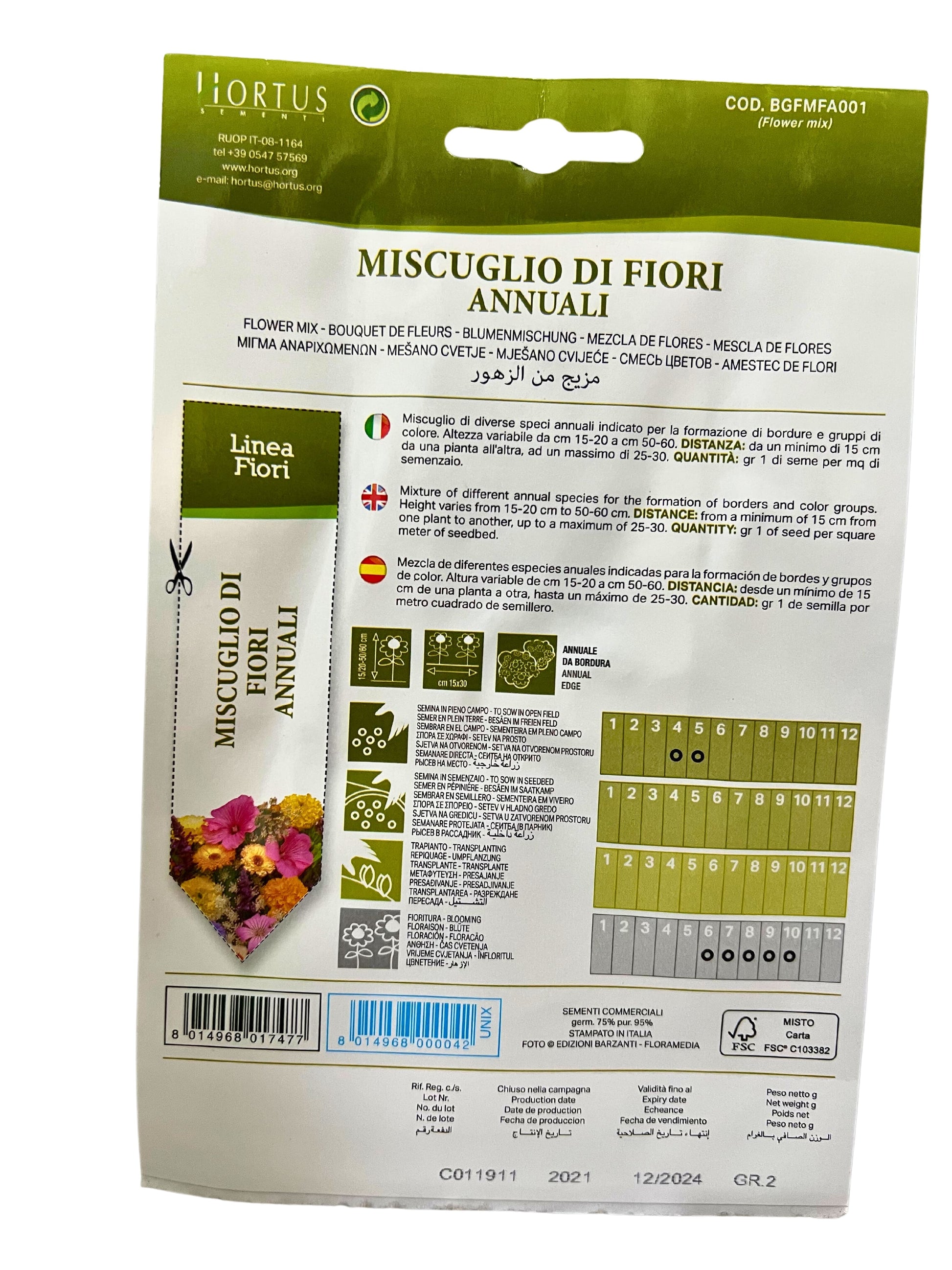 Mixture of different annual species for the formation of borders and colour groups. Height varies from 15-20 cm to 50-60 cm. Distance: from a minimum of 15 cm from one plant to another, up to a maximum of 20-30 cm. Quantity: gr 1 of seed per square meter of seedbed.