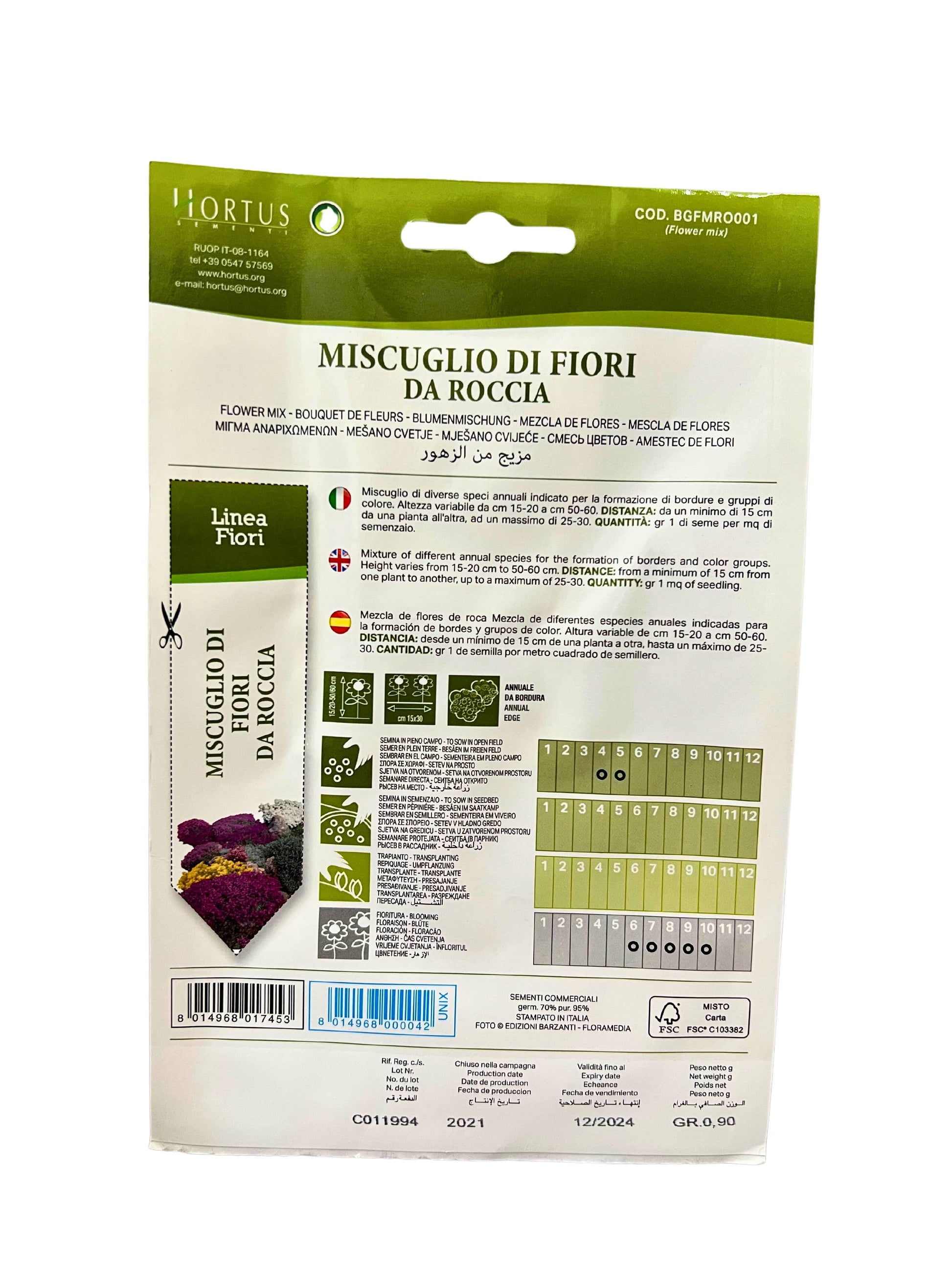 Mixture of different annual species for the formation of borders and colour groups. Height varies from 15-20 cm to 50-60 cm. Distance: from a minimum of 15 cm from one plant to another, up to a maximum of 25-30. Quantity: gr 1 mq of seedling.