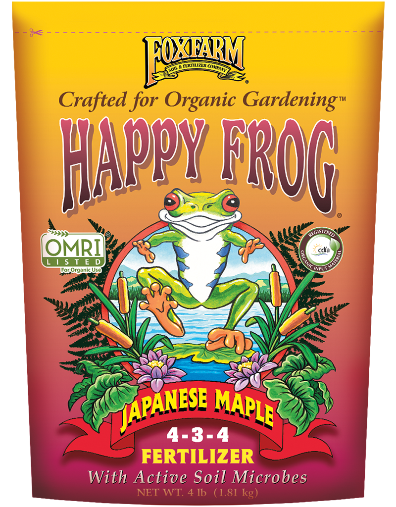 Happy Frog® Japanese Maple Fertilizer is specifically formulated for use on Japanese maples, lilies, evergreens, hydrangeas, junipers, dogwoods, flowering ornamentals, and other low pH feeders. This unique blend of fertilizers and microorganisms delivers nutrition where your plants need it most. Contains phosphorus and potassium to support the needs of these beautiful trees. Mycorrhizal fungi are included to help increase root efficiency, which may enhance nutrient uptake and water absorption. OMRI Listed® and Registered CDFA Organic Input Material.