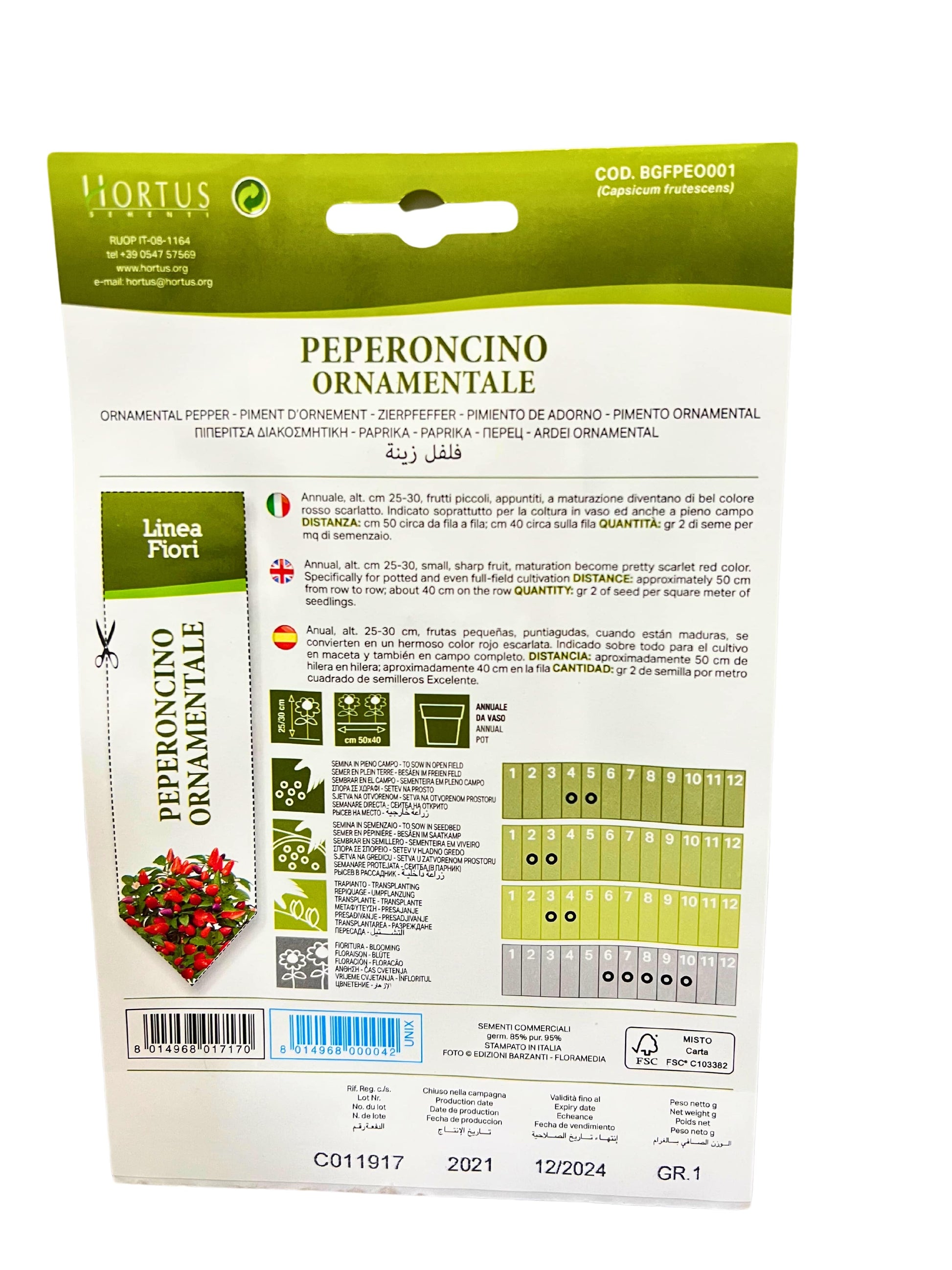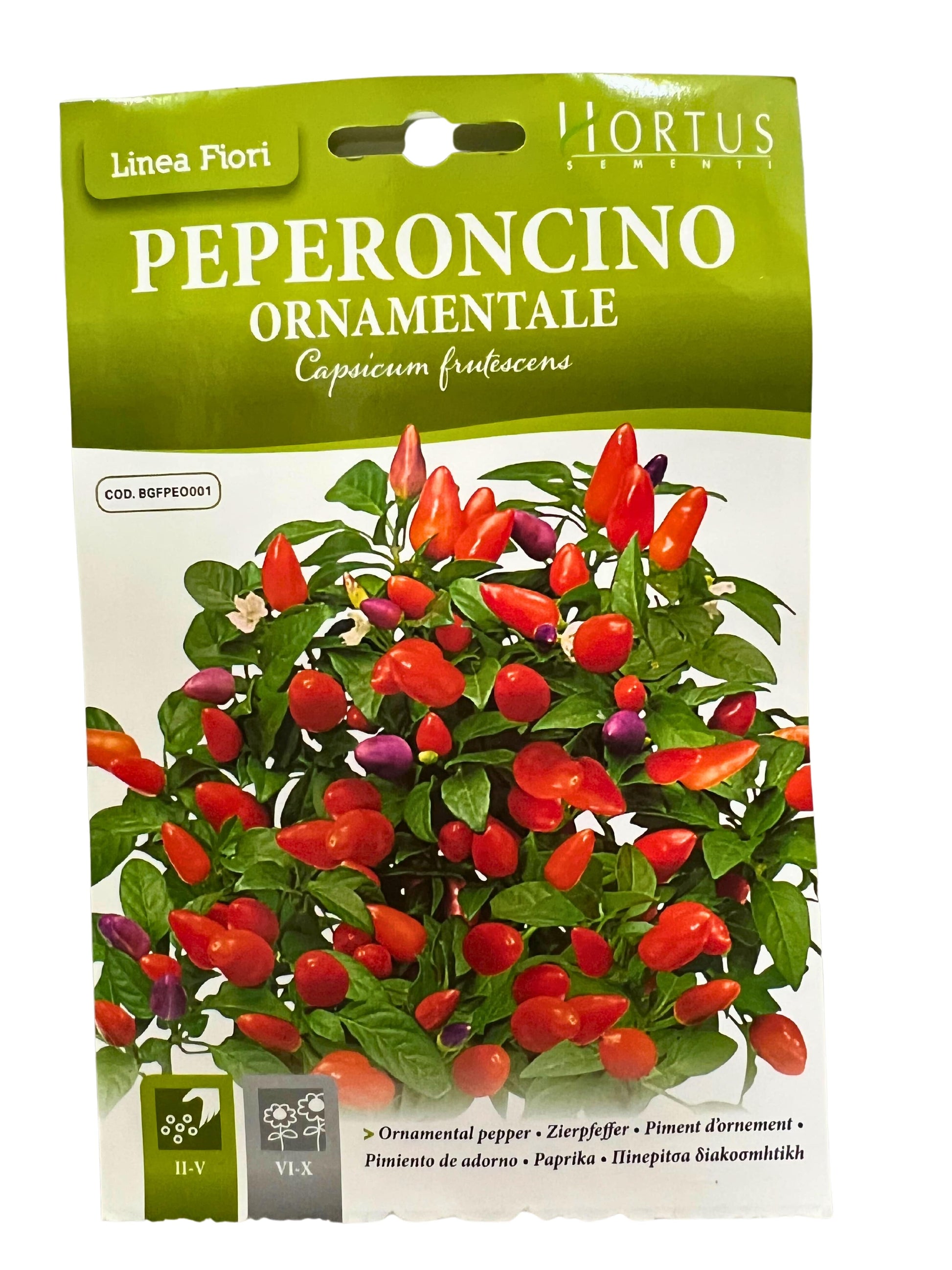 Small and pointed ornamental chillies of a scarlet red. It should be grown in a pot and reaches a height of about 25/30 cm. It flowers from June to October . The fruits have a spicy taste.Place a group of 3/5 seeds on the surface at a distance of about 45 cm from each other.