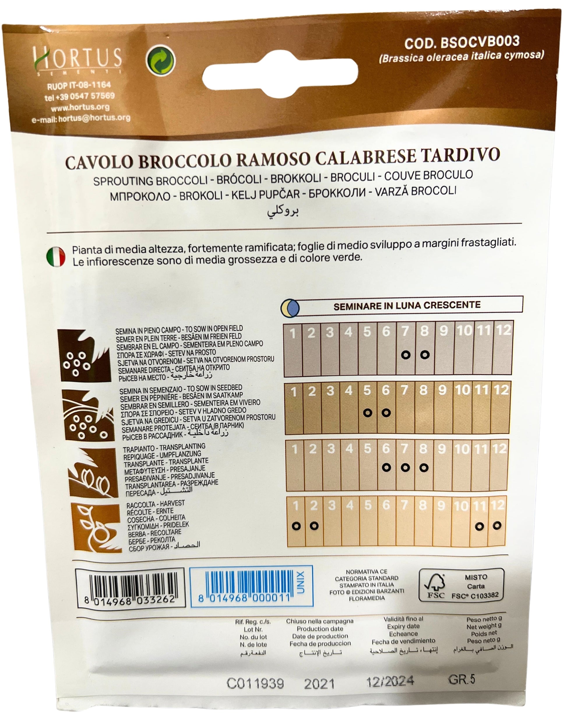 Produces a large branched inflorescence of an intense green color. This late variety is sown in October-November and harvested in winter. Sowing depth in cm: 1Distance between and on the row in cm: 60x50