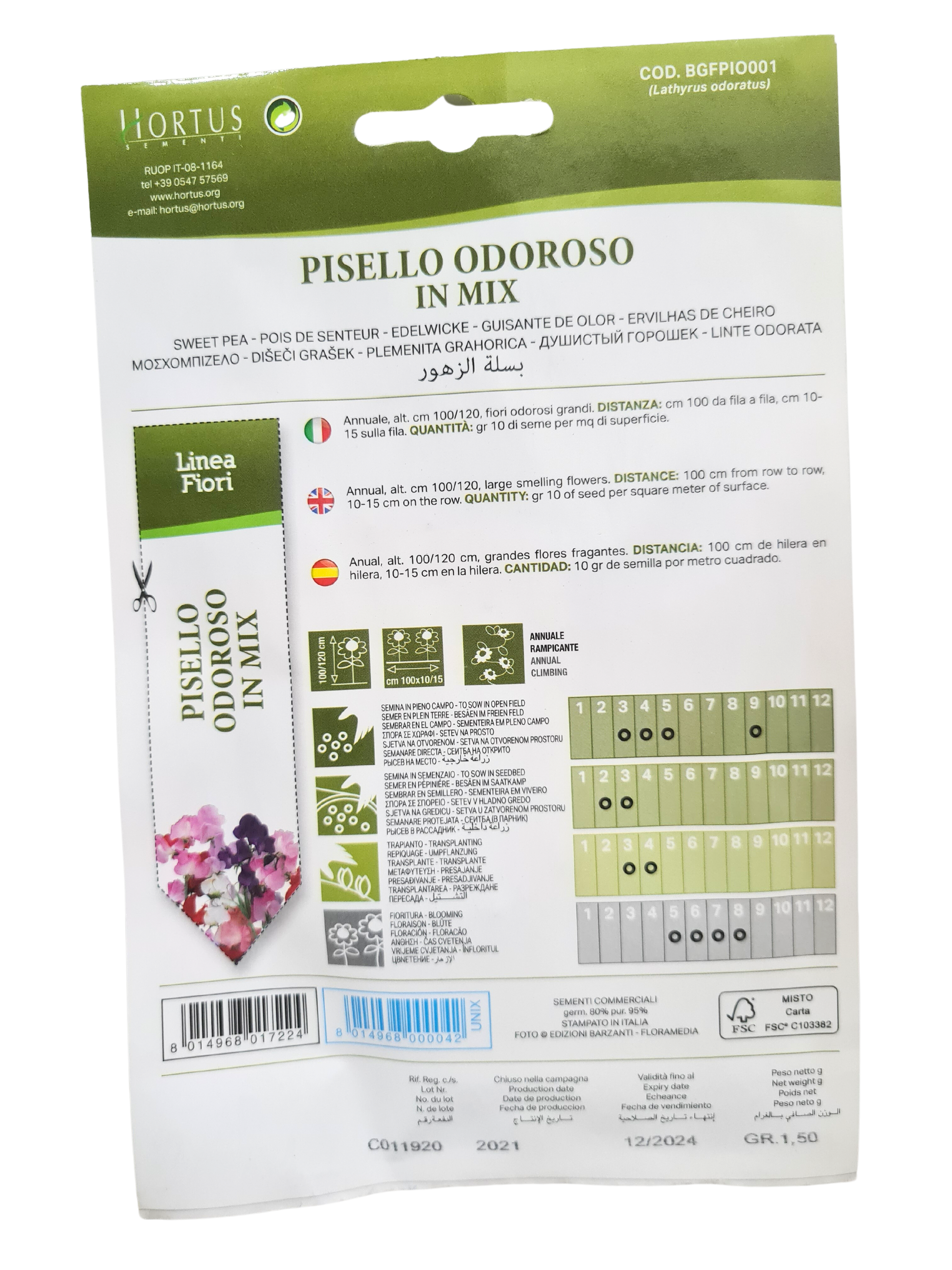Annual, alt. cm 100/120, large smelling flowers. Distance: 100 cm from row to row, 10-15 cm on the row. Quantity: gr 10 of seed per square meter of surface.