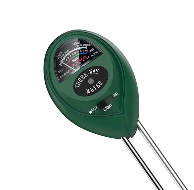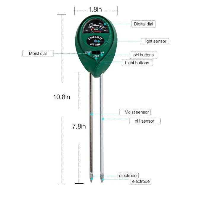 - Three different soil test meters in one device; Measures moisture, pH/Acidity, and light.