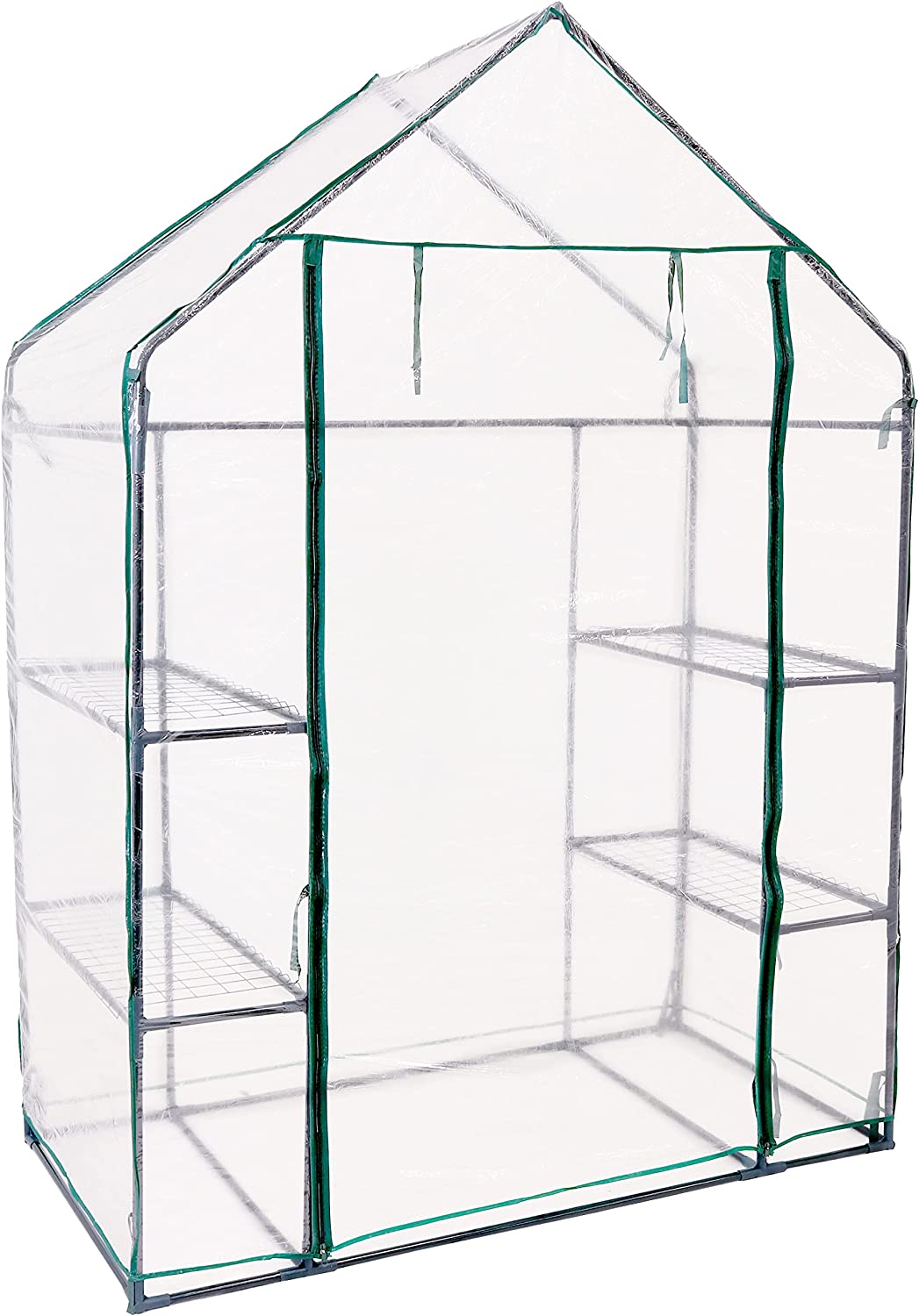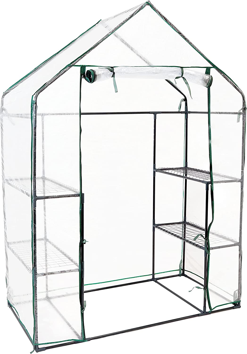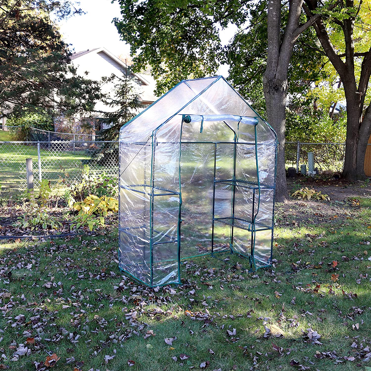 • Use year after year: Made from an iron tube frame, this small outdoor greenhouse is sure to last through several growing seasons. Each shelf is made from steel wire to support the weight of growing plants. The light-filtering cover is made from durable PVC with a transparent coating to protect plants from harmful UV rays and weather conditions. This walk-in greenhouse includes 4 stakes and 4 ropes to secure it to the ground.